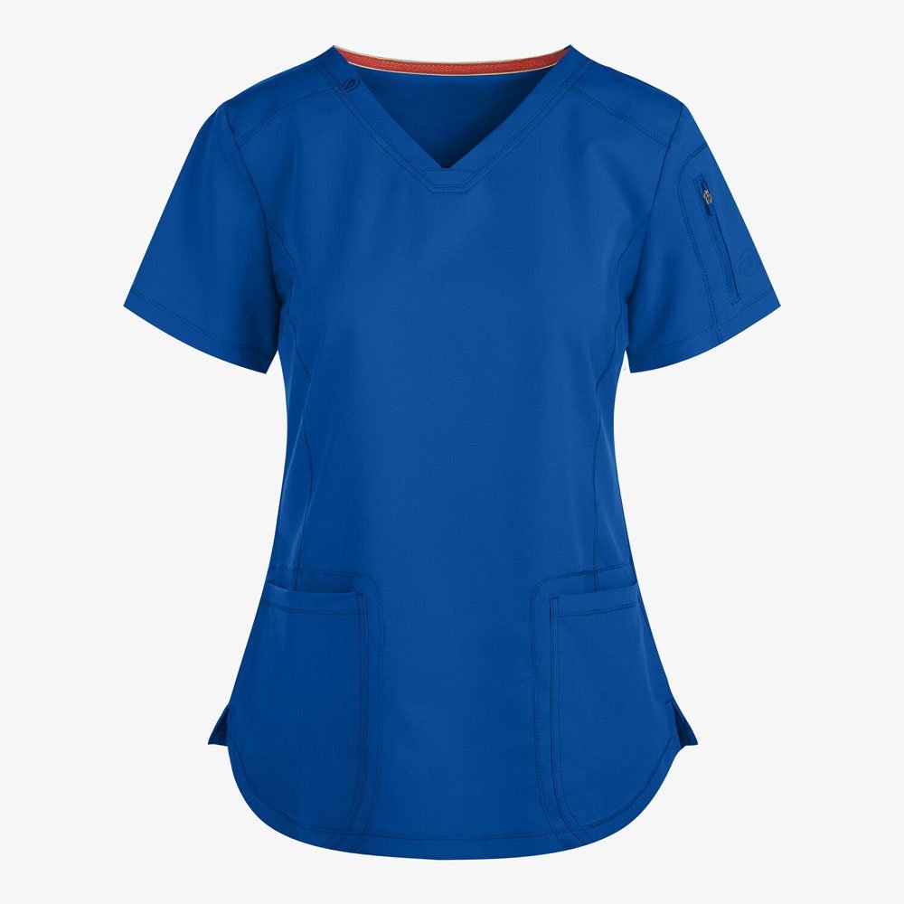 For the Dickies Dynamix V-Neck Scrub Top, the difference is in the details—from front to back—yoke, princess seams with coverstitching and shirttail hem. True to its reputation for quality workwear, Dickies Dynamix combines sporty styling with functional details, and is crafted from flexible, easy-care 4-way stretch textured dobby fabric.