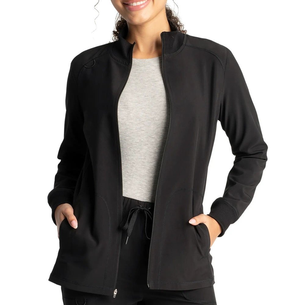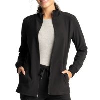 Women's 4 pocket Raglan Warm Up Scrub Jacket features a classic fit, stand up collar, full front zipper closure, raglan sleeves with rib knit cuffs, bungee ID loop on right shoulder, and 4 pocket: 2 front angled welt pockets and 2 in seam side pockets. Fabric content is 76/21/3 poly/rayon/spandex, rib knit is 92/8 poly/spandex.