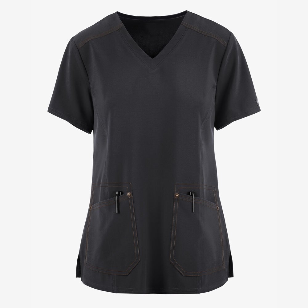 evel up your work wear with our classic and eye catching V-Neck. The Dickies Riveting Collection builds on the growing trend of designer's juxtaposition of soft and hard elements: perceived rugged workwear on feminine silhouettes. Dickies proven style, a utilitarian feel that includes contrast double stitching and rivets, and simply timeless cuts.